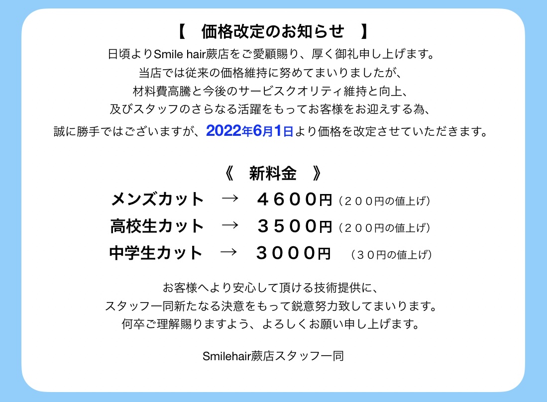 ※カラー、パーマは受付終了時間が1時間ずつ繰り上げになります