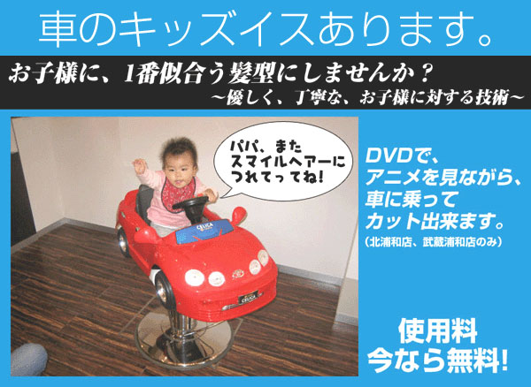 小さなお子様は、車(セリカ)のイスでアニメを見ながらカットができます(北浦和店、武蔵浦和店のみのサービスです。)!!